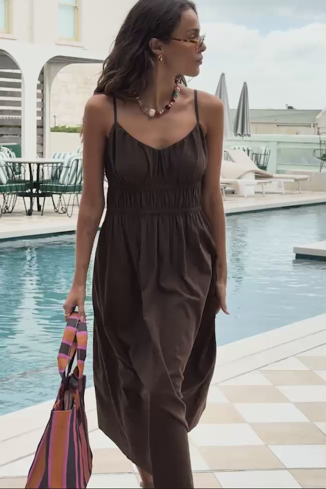 The Rhea Midi Dress is crafted from organic textured cotton, offering a lightweight soft hand-feel. Its elasticated waist and adjustable straps ensure a flattering fit, while handy side pockets keep essentials close. A versatile easy to wear dress that can be dressed up or down for any occasion.
