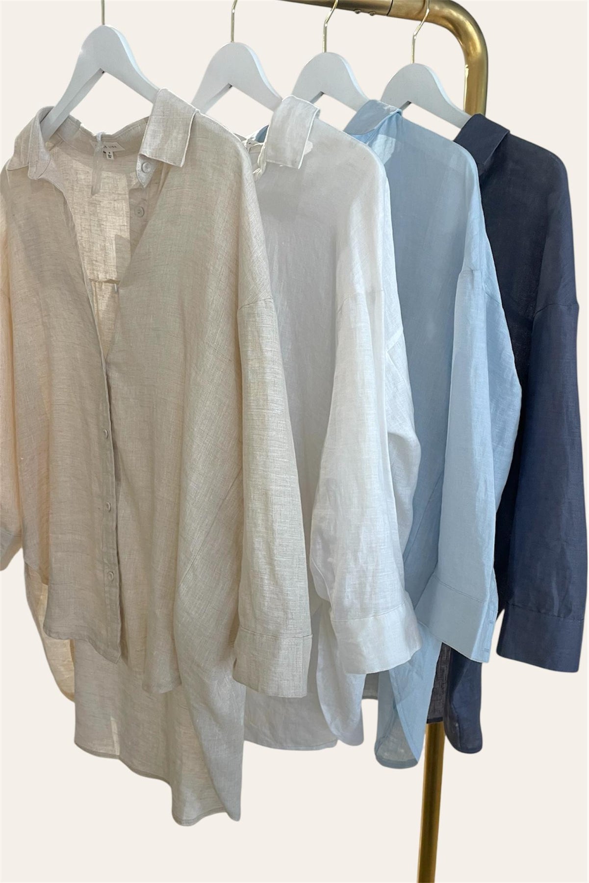 Effortlessly stylish and breathable, the Linen Boyfriend Shirt in chambray blue by Little Lies offers a relaxed, longline silhouette with a hi-low hem and a slightly oversized fit. Made from lightweight linen, this versatile button-up shirt is ideal for layering or wearing alone. Its soft blue shade adds a crisp, refreshing touch perfect for spring and summer.