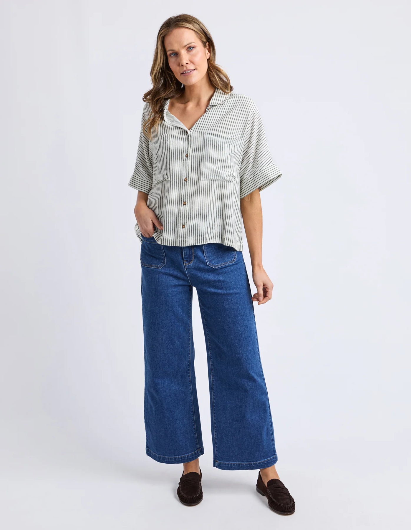 The Elm Ruth Short Sleeve Shirt is a lightweight everyday piece featuring a printed stripe and relaxed fit. Designed with front pockets and crafted from a breathable viscose-linen blend, it’s perfect for warm-weather wear. Style with relaxed pants or shorts for effortless daywear.